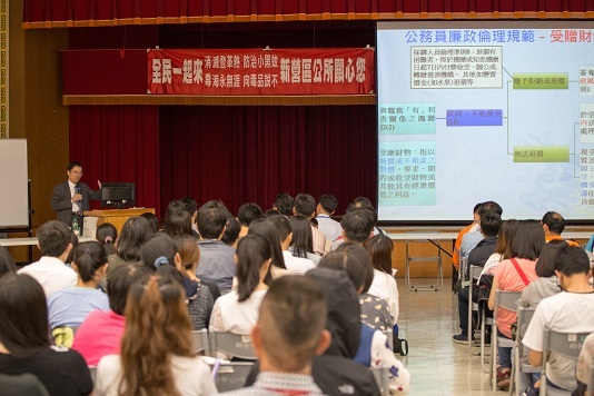 臺南市政府觀光旅遊局108年4月17日下午於新營區公所3樓禮堂辦理108年度基層扎根廉政工程座談會,本次座談會邀請臺灣臺南地方檢察署林錦村檢察長擔任講座,各局處同仁共有138人踴躍參加,場面相當熱絡。會中觀旅局林副局長國華勉許各位在座與會同仁能勇於任事,落實市府「清廉效率、公開透明」施政核心理念。