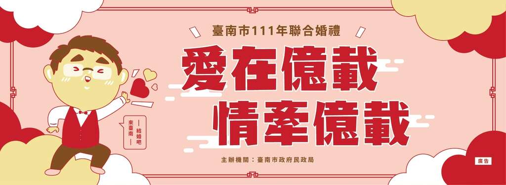 臺南市111年聯合婚禮活動訂於111年7月15日中午12時起正式受理報名(50對額滿截止),歡迎踴躍參與,詳情請參閱