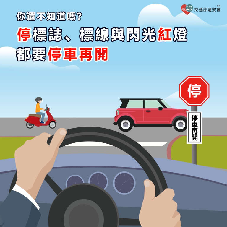 看到閃光紅燈、「停」標誌及標線,車輛應停車(車輪須完全停止狀態),確認無人車再通過。