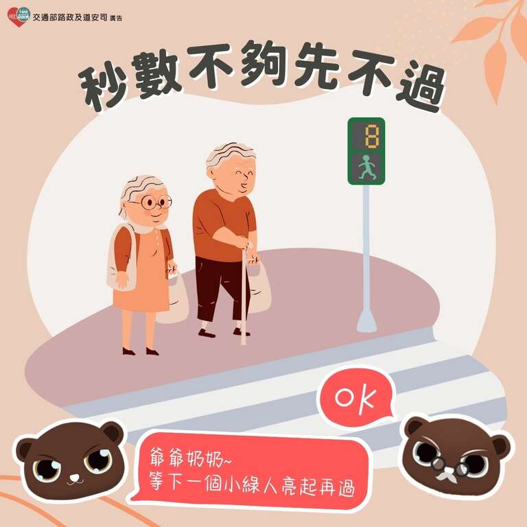 本次宣導主題:「長輩早起散步過馬路,小綠人秒數不夠先不過!」。